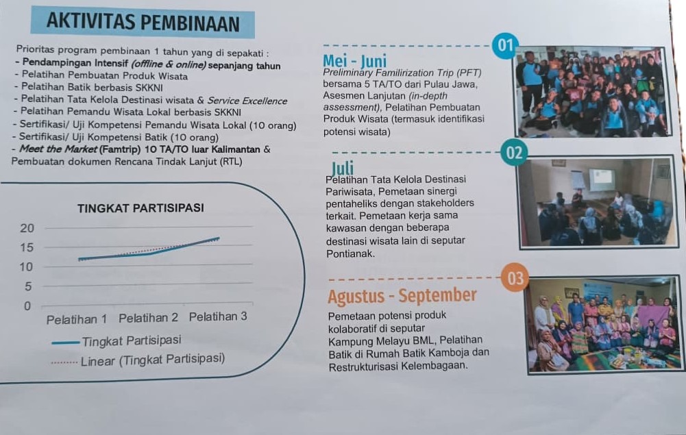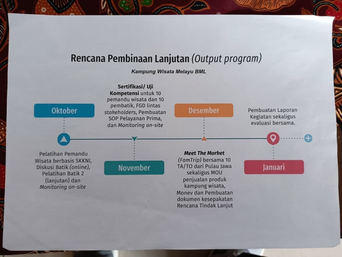 Puncak dari pendampingan Caventer adalah proses evaluasi dan kesiapan pemasaran. Selama masa bimbingan, Caventer membantu Pokdarwis BML dalam menyusun paket wisata yang terstruktur, mengembangkan e-katalog produk UMKM yang menarik, hingga menyempurnakan tata kelola desa wisata. Fase paling krusial adalah ketika Caventer memfasilitasi pertemuan antara Pokdarwis BML dengan berbagai agen perjalanan (travel agent) dari luar daerah, seperti Jawa. Momen business meeting ini berfungsi sebagai bentuk review bisnis nyata; para agen perjalanan menilai kelayakan produk, potensi investasi, dan peluang kerja sama pemasaran. Melalui evaluasi ketat dan pendampingan profesional ini, Caventer memastikan bahwa produk andalan Kampong Melayu BML siap untuk diterima dan dipasarkan secara luas, menjadikan BML model ideal dari pengembangan desa wisata yang berkelanjutan.